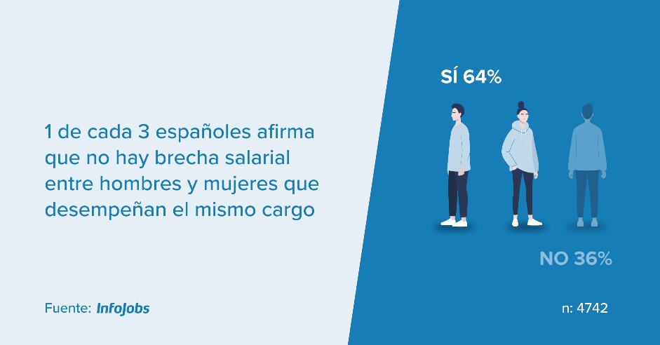 Pese a que, según organismos oficiales, la brecha salarial sigue siendo un problema por resolver en la mayoría de países europeos, y se ha acentuado en España a causa de la COVID, 1 de cada 3 españoles afirma que no hay brecha salarial entre hombres y mujeres que desempeñan el mismo cargo, proporción que aumenta en el segmento de los hombres. Así concluye una de las principales líneas del Informe sobre Igualdad de Género que ha elaborado InfoJobs, empresa líder en empleo en España, cogiendo como muestra a Población Activa (PA) y Empresas.