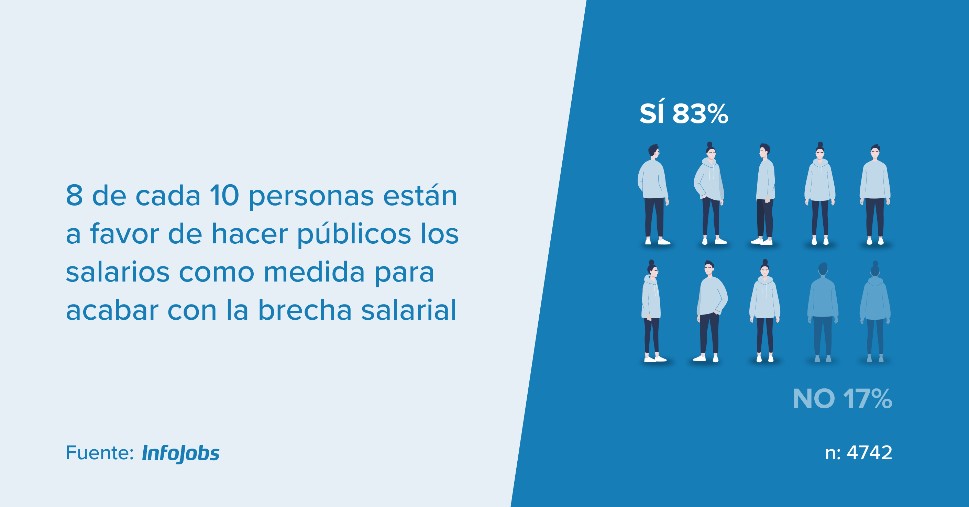 Este Informe de InfoJobs también recoge la opinión de la PA sobre la transparencia salarial. De esta manera, 8 de cada 10 españoles están a favor de hacer públicos los salarios como medida para acabar con la brecha salarial. También son las mujeres (88% de menciones) las que se muestran más a favor que los hombres (78%) de hacer públicos los salarios. Sin embargo, sólo 7 de cada 10 empresas están dispuestas a adoptar este tipo de medidas de transparencia salarial, siendo las pequeñas y de sectores primario y secundario las más reacias a ello.