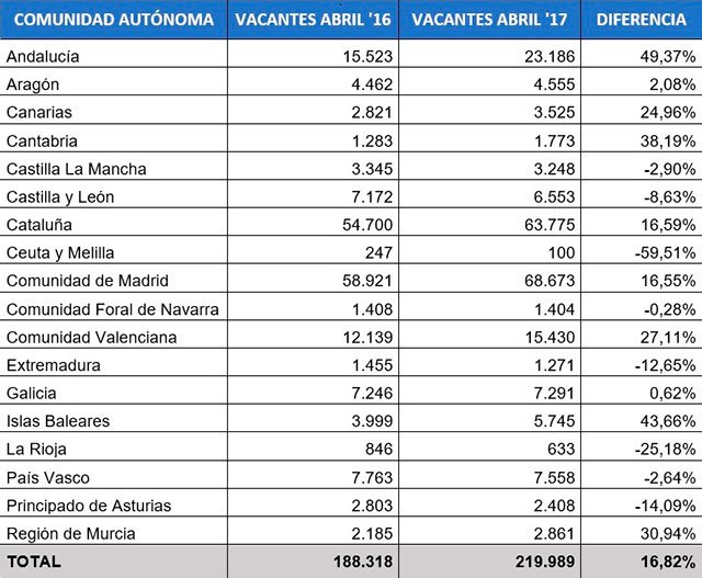 - InfoJobs registra un total de 219.989 vacantes en abril, 31.671 puestos más que en abril de 2016