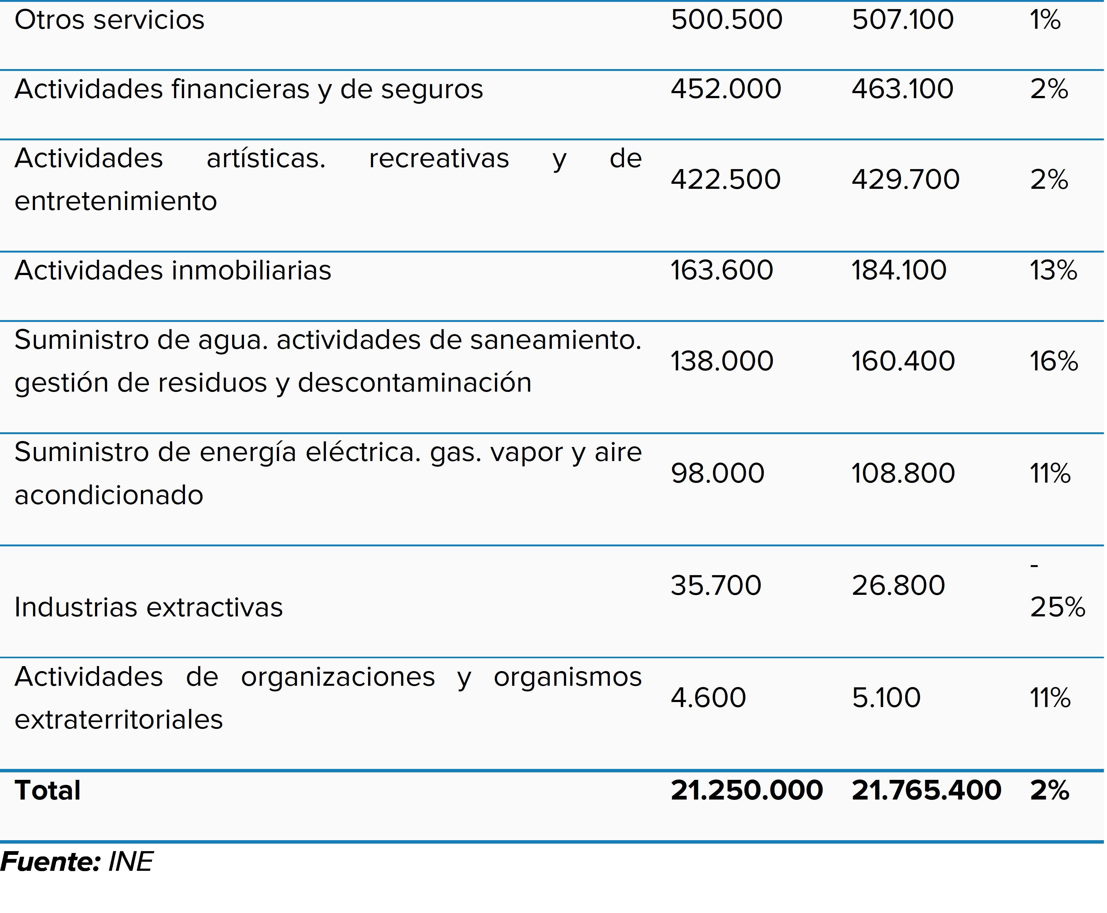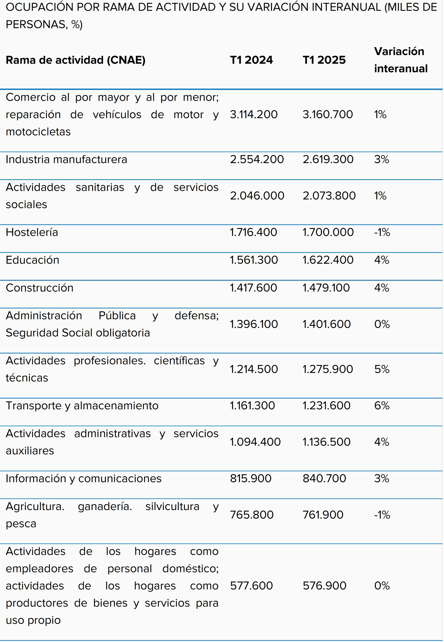 En prácticamente todas ellas, la población empleada ha aumentado en el último año. No obstante, el ritmo de crecimiento varía de unas a otras. Por ejemplo, educación suma un 4 % de ocupación, frente al 1 % del comercio al por mayor y al por menor o el 1 % de las actividades sanitarias y la industria manufacturera (3 %). Por su parte, en hostelería se ha producido un ligero retroceso (-1 %) de la población ocupada en los últimos doce meses.