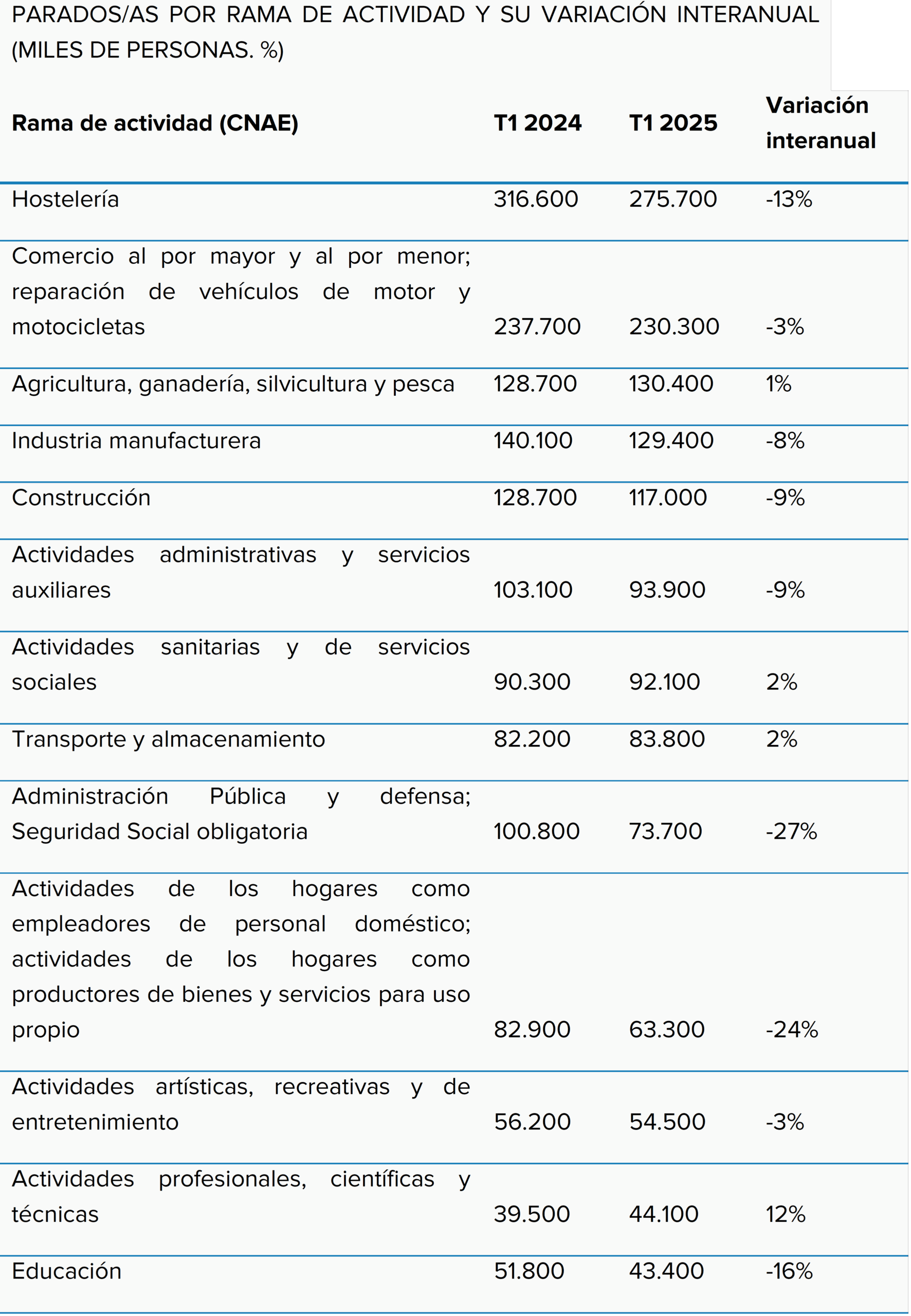 Otro indicador para analizar la evolución del empleo por sectores es el paro y su variación interanual. Según los datos de la última Encuesta de Población Activa, los sectores con más ocupación aglutinan también un mayor desempleo. Así, este ranking lo encabezan hostelería (275.700 parados/as), comercio al por mayor y al por menor (230.300) y agricultura (130.400).