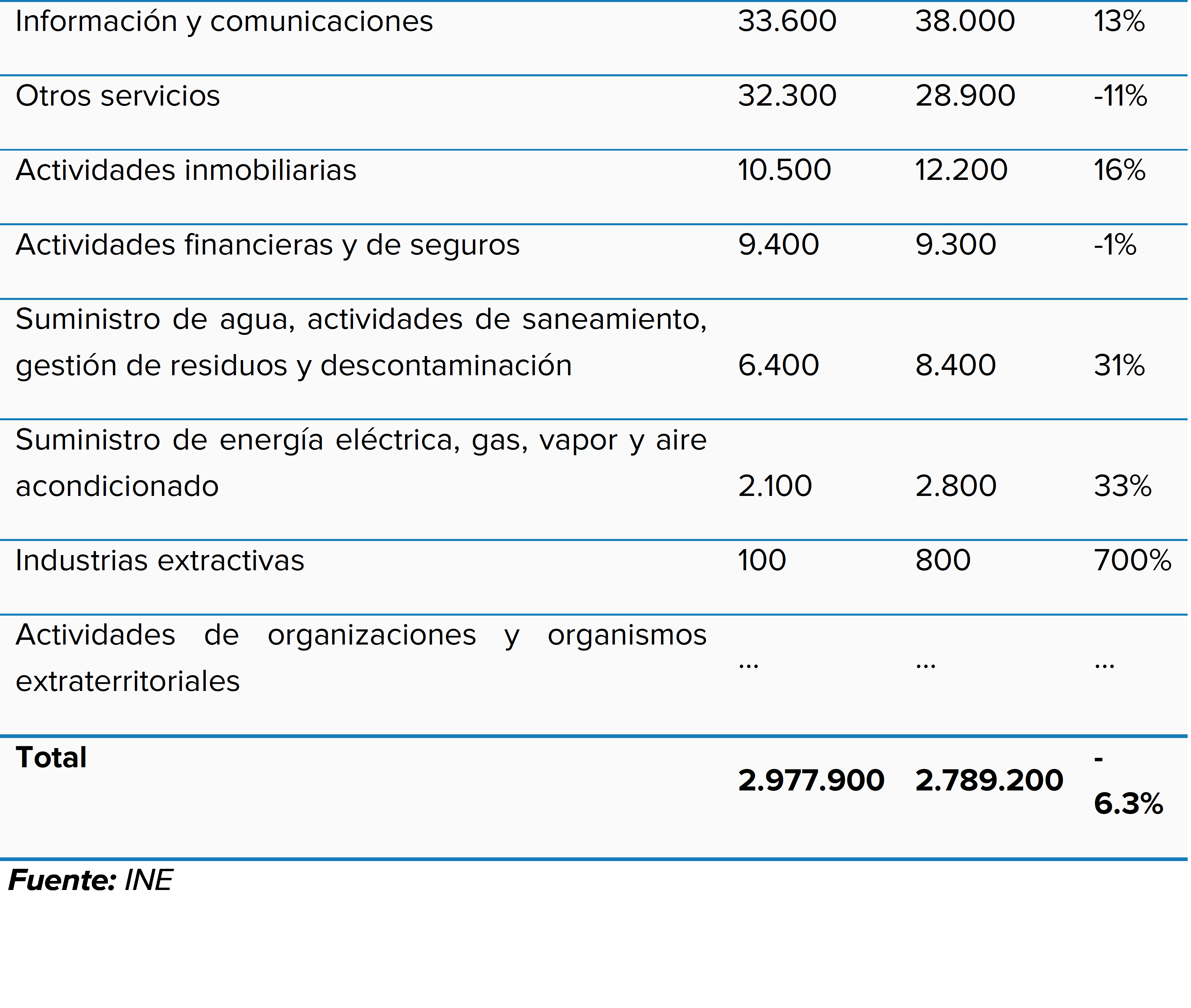 - La ocupación en hostelería cae un 1 % en los últimos doce meses. Por su parte, destaca el crecimiento de sectores como actividades inmobiliarias (+13 %) o transporte y almacenamiento (+6 %)