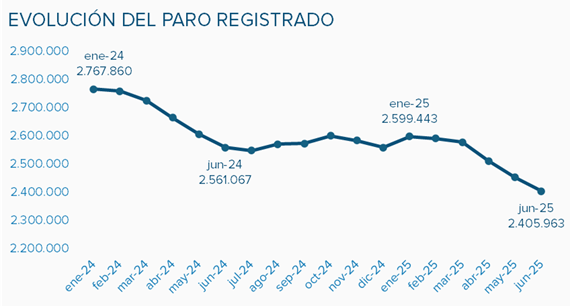 - Durante los seis primeros meses de 2025 el paro registrado ha descendido en 193.480 personas