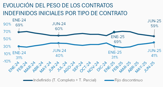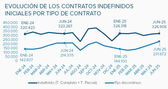 Si se observan los datos de los últimos seis meses de estas dos modalidades, se puede apreciar que, mientras que los primeros han experimentado se mantienen prácticamente igual, los fijos discontinuos han crecido en torno a un 60 % con respecto a enero. Así, mientras que en enero se firmaron 326.318 contratos iniciales indefinidos a jornada completa o parcial, en junio han sido 326.906. Sin embargo, los contratos fijos discontinuos fueron 144.100 en enero y 231.672 en junio.