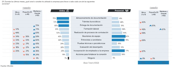 - Dentro del seguimiento anual que realiza InfoJobs sobre los aspectos clave de la digitalización se observa que la transición digital sigue siendo desigual: las pequeñas empresas continúan recurriendo a canales presenciales para acciones tan habituales como la entrega de documentación, y las de más de 50 trabajadores hacen un mayor uso del canal online