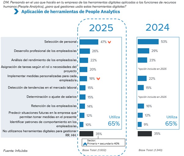 En materia de Recursos Humanos, el informe de la plataforma constata que 7 de cada 10 empresas utilizan herramientas digitales en las funciones de RR. HH. (People Analytics), mientras que 1 de cada 3 no las emplea. Estos datos son iguales a los registrados el año pasado (2024). Asimismo, es en los sectores primario y secundario donde menos uso se hace de ellas (un 40% declara no utilizarlas).