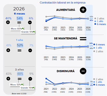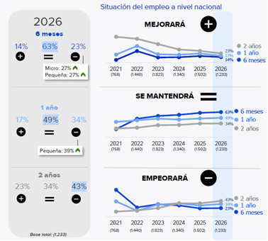 Además, esta valoración varía por tamaño: en el corto plazo, las micro y las pequeñas empresas muestran una mayor inclinación a anticipar un empeoramiento del empleo nacional (27% en ambos casos), cuatro puntos porcentuales por encima del conjunto de las compañías.