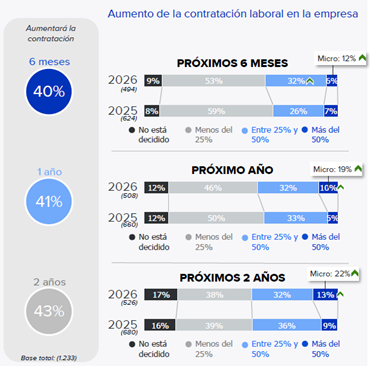 Por tamaño de empresa, las micro concentran una mayor proporción de incrementos superiores al 50% entre quienes prevén aumentar su plantilla, lo que explica que en este tramo se haya intensificado la contratación respecto a 2025. Esta pauta se intensifica a medida que se amplía el horizonte temporal, pasando del 12% en los próximos seis meses al 19% en un año y al 22% en dos años.