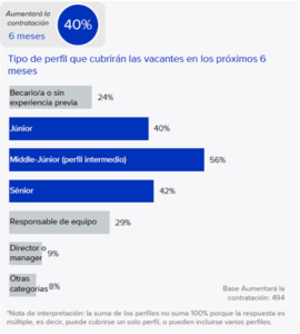 En menor medida, el 29% prevé incorporar a responsables de equipo, el 24% contempla perfiles sin experiencia previa o becarios y un 9% anticipa contrataciones de perfil directivo.