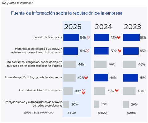 - La web corporativa (54%) y las plataformas de empleo (51%), con InfoJobs a la cabeza, continúan siendo los principales canales para informarse sobre la reputación