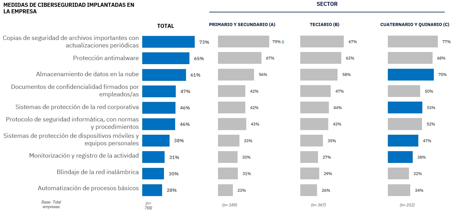 En el lado de las empresas, las medidas más empleadas son las copias de seguridad de archivos importantes (73%), la protección antimalware (65%) y el almacenamiento de datos en la nube (61%). En este sentido, las empresas más ligadas al ámbito de la tecnología y la digitalización (sectores cuaternario y quinario) son las que implementan en mayor proporción el almacenamiento de datos en la nube (70%, nueve puntos porcentuales por encima de la media), el uso de sistemas de protección de la red corporativa (53%, siete puntos porcentuales por encima de la media), la protección de dispositivos móviles y equipos personales (47% frente al 38% de media) o la monitorización y registro de la actividad (38% frente al 31% de media).