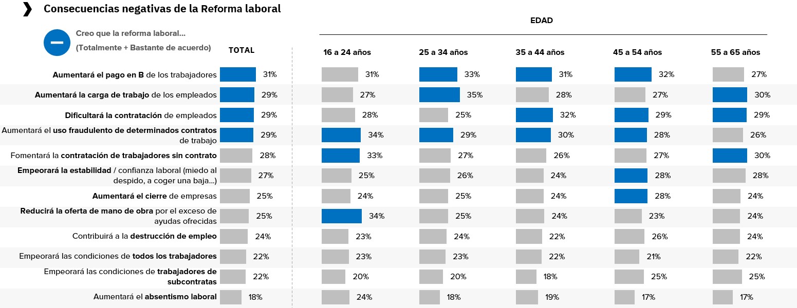 Por otra parte, el segmento más joven cree que la reforma laboral repercutirá en un mal uso de los contratos y en la reducción de oferta de mano de obra; y los trabajadores de 45 a 54 años creen que empeorará la estabilidad laboral y aumentará el cierre de empresas.