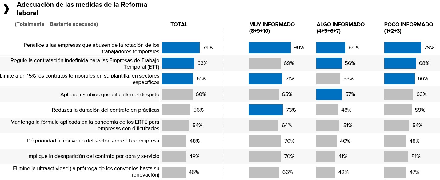 Entre quienes ostentan un mayor conocimiento sobre los principales puntos que aborda la reforma del Gobierno (muy informados y algo informados), cabe destacar que el 77% ve con buenos ojos que se penalice a las empresas que abusen de la rotación de los trabajadores temporales. Además, el 62,5% apoya que se regule la contratación indefinida para las Empresas de Trabajo Temporal (ETT); y el 62% está a favor de que se limite a un 15% los contratos temporales en su plantilla, en sectores específicos.