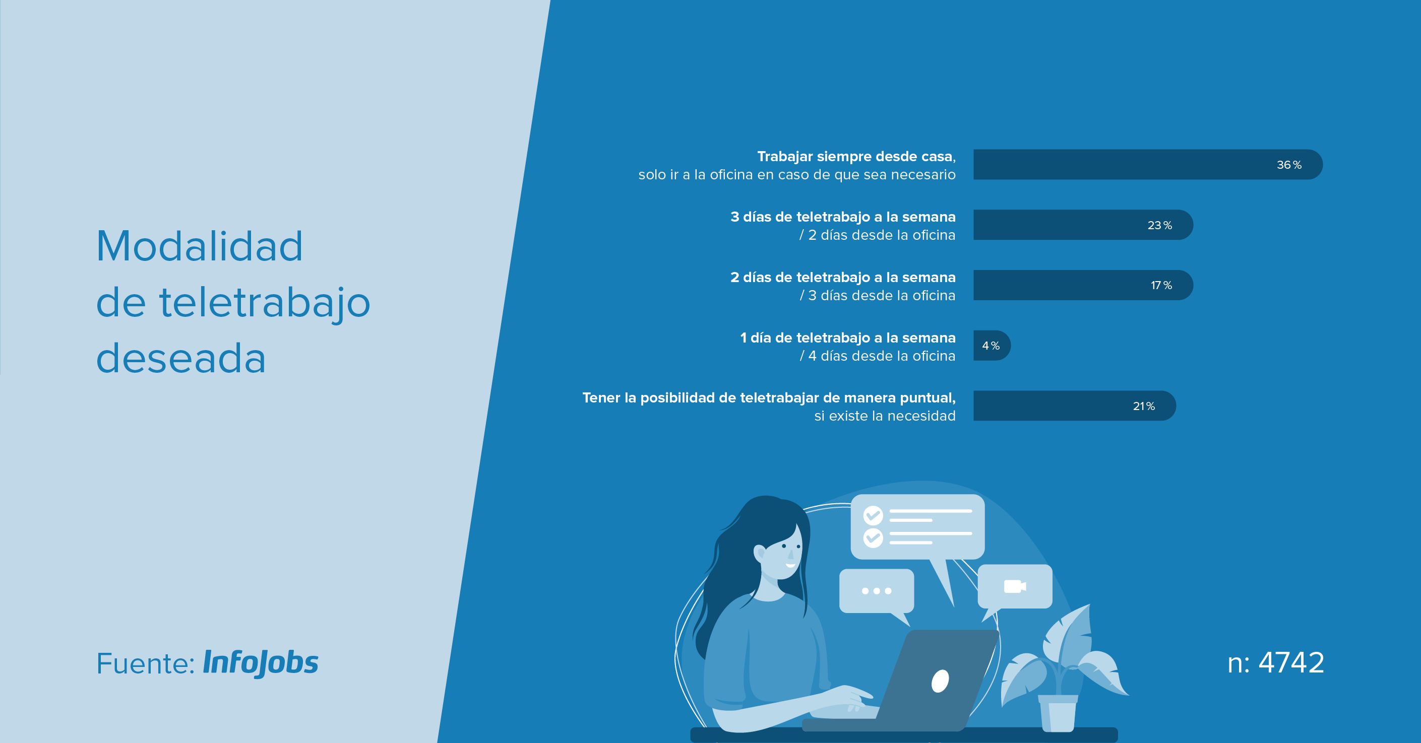 Así, a un 36% de los encuestados les gustaría teletrabajar siempre desde casa, e ir solo a la oficina por necesidad; mientras que un 40% preferiría teletrabajar solo 2 o 3 días a la semana. Otro 21% de la población activa señala que le gustaría tener la posibilidad de teletrabajar de manera puntual, si existe la necesidad. Por otra parte, a 6 de cada 10 trabajadores que no están teletrabajando actualmente, les gustaría tener esta posibilidad.