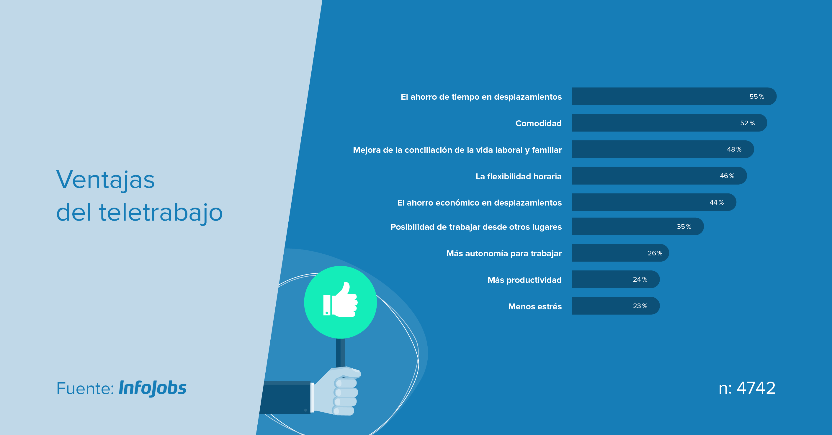 - Por el contrario, el ahorro en tiempo de desplazamiento (55%) es el principal beneficio asociado a este modelo laboral, seguido de la comodidad (52%) y la mejora de la conciliación (48%)