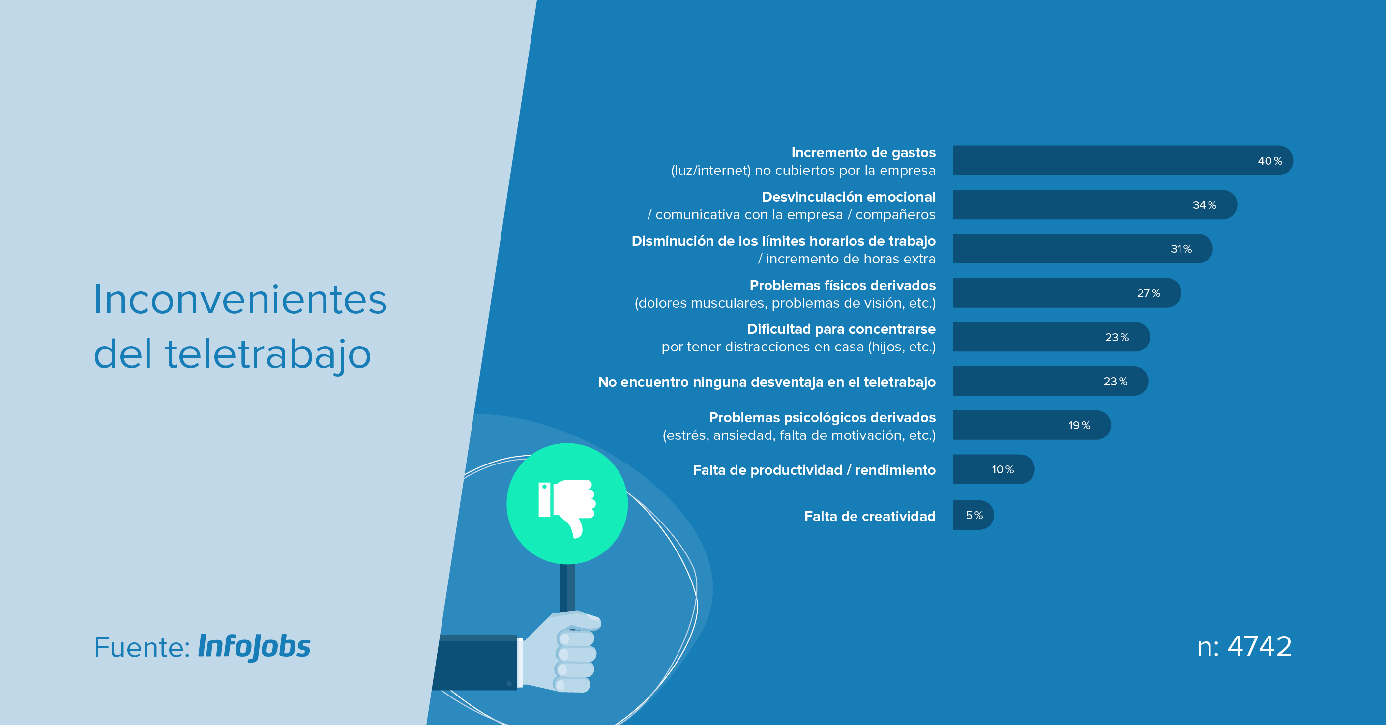 Seis meses después de la aprobación de dicho decreto ley, el 40% de los españoles afirman sin embargo que la principal problemática del actual teletrabajo es el incremento de los gastos de luz e internet en el hogar, según datos del Informe de InfoJobs sobre Teletrabajo* elaborado en colaboración con The Cocktail Analysis. La desvinculación emocional con la empresa/compañeros (34%) y la disminución de los límites horarios (31%) son los otros dos aspectos que más preocupan a la población activa.