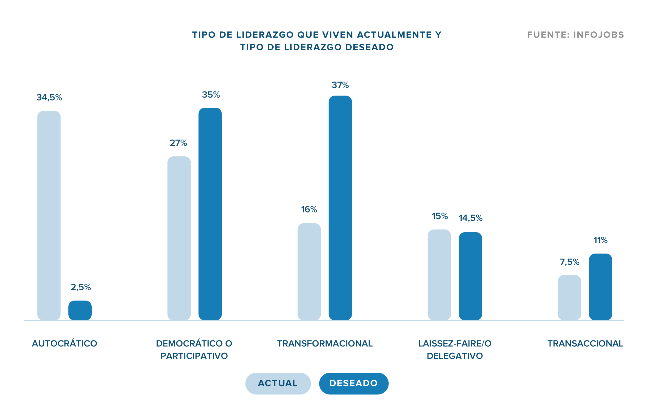 - Sin embargo, se trata del estilo de dirección menos deseado por los españoles. Solo un 2,4% de la población activa declara que está de acuerdo con este modelo de liderazgo. En el lado opuesto se sitúa el liderazgo transformacional, que apuesta por las personas y su potencial para generar implicación y motivación y es el favorito para el 37% de los encuestados