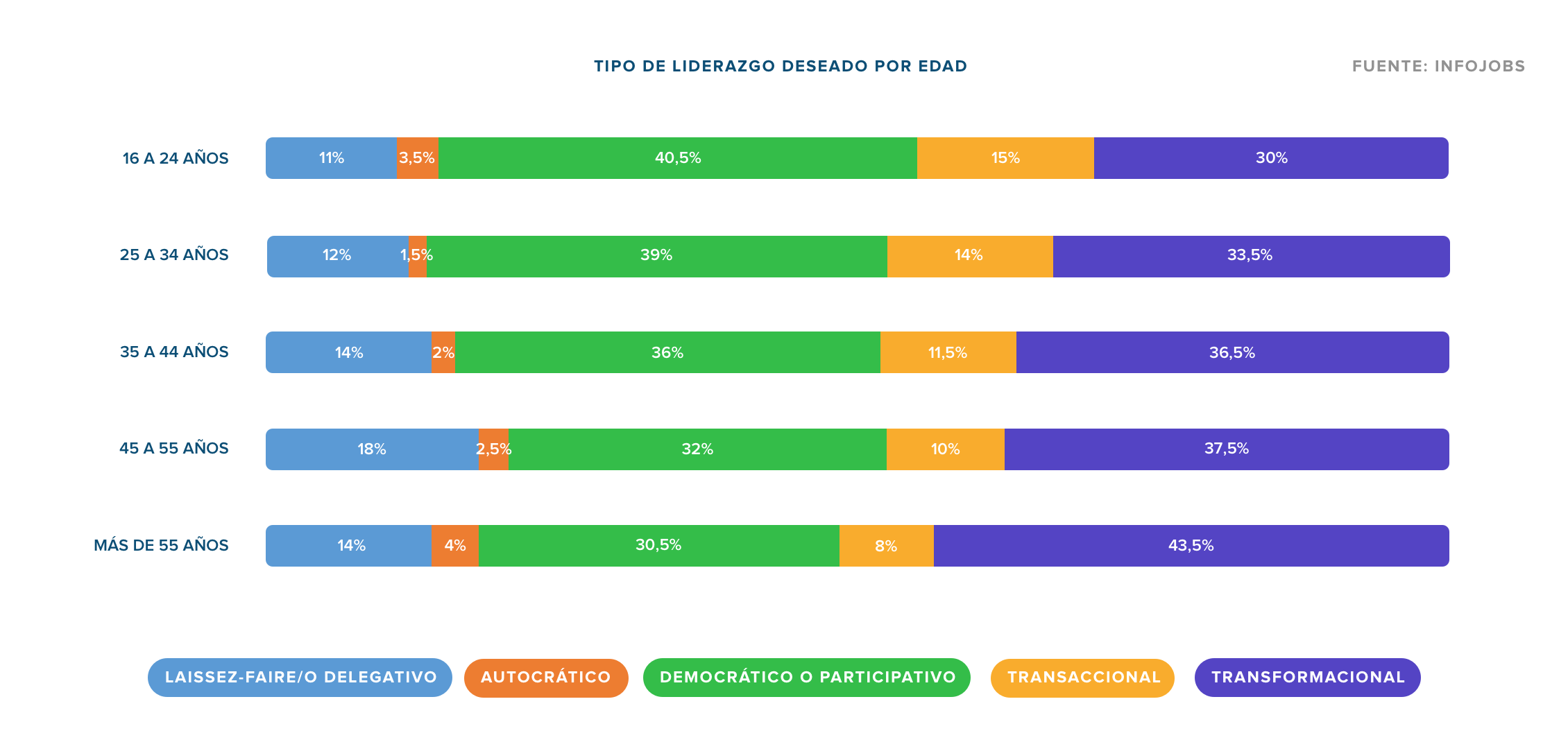 Los datos de InfoJobs revelan, también, diferencias significativas en función de la edad de los empleados. La tendencia es que a más edad hay menor interés por el liderazgo democrático y por el liderazgo transaccional y, en cambio, hay mayor preferencia por el liderazgo transformacional. La madurez y experiencia que se adquieren con la edad, explican esta preferencia.
