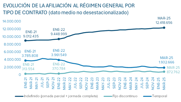 Si se analizan los datos de afiliación al régimen general en función del tipo de contrato (dato medio no desestacionalizado), actualmente hay 12.418.656 personas en situación de alta laboral con un contrato indefinido, 872.762 afiliados/as con uno fijo discontinuo y 1.932.666 afiliados/as con un contrato temporal.