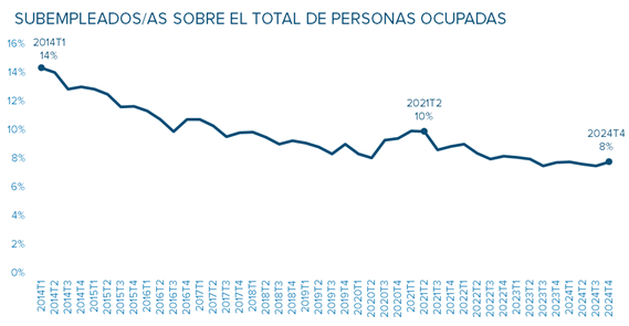 Si se observa cómo ha evolucionado la presencia de subempleados/as sobre el conjunto de ocupados/as, existe una tendencia positiva. En comparación con hace una década, su presencia se ha reducido prácticamente a la mitad. Así durante el año 2014 su peso osciló entre el 13 % y el 14 %, frente al 8 % en el que se ha situado durante todo 2024, según los datos del INE.