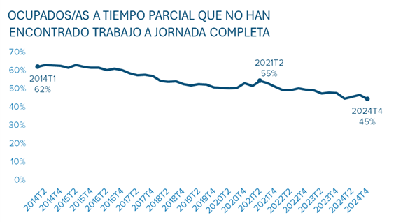 Para entender la evolución del subempleo es imprescindible también aproximarse al segmento de la población ocupada que trabaja a jornada parcial, que son 3,1 millones de personas actualmente. Así, casi la mitad (45 %) asegura que desempeña su trabajo en este tipo de jornada porque no ha encontrado un empleo a jornada completa. Pese a lo elevado de esta cifra, se trata de un indicador que también muestra una clara tendencia decreciente, puesto que hace diez años eran el 62 % los que realizaban esta afirmación.