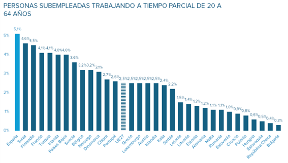No obstante, pese a la buena tendencia experimentada por el subempleo en los últimos años, España lidera el ranking de países con mayor subempleo, según los datos correspondientes al año 2024. En este caso, la definición de Eurostat abarca exclusivamente a las personas que trabajan a tiempo parcial, desearían trabajar más horas y están disponibles para hacerlo. La media europea se sitúa en el 2,5 %, frente al 5,1 % de España. Tras nuestro país se ubican Suiza (4,6 %), Finlandia (4,5 %) y Francia (4,1 %). En el extremo opuesto se encuentran países como Bulgaria, República Checa, Hungría o Polonia. En todos ellos el subempleo se sitúa por debajo del 1%.
