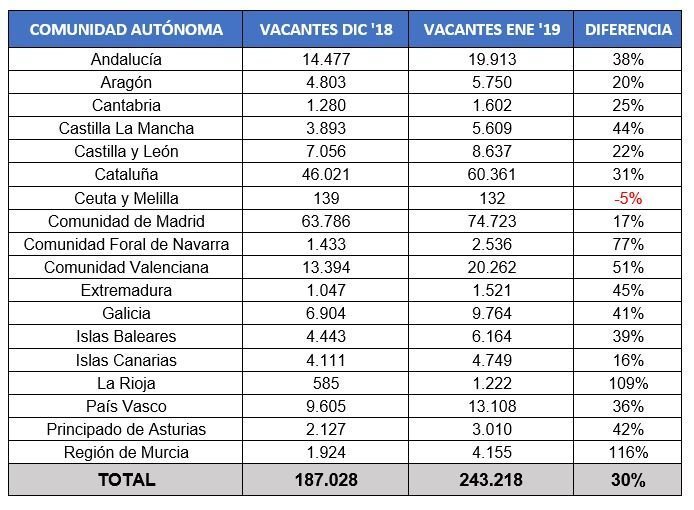En enero, la Comunidad de Madrid (74.723 vacantes) y Cataluña (60.361 vacantes) han sido, de nuevo, las principales generadoras de empleo en España. Por su parte, la Comunidad Valenciana, con 20.262 vacantes publicadas, ha pasado a ocupar la tercera posición, por encima de Andalucía.