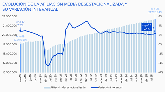 En lo que va de año, la afiliación media desestacionalizada ha mantenido un crecimiento estable ligeramente superior al 2 %. Así, entre enero y septiembre España ha sumado 365.542 nuevos afiliados, manteniendo este indicador en máximos y aproximándose cada vez más a los 22 millones.