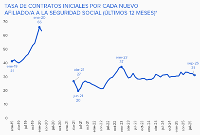 Más allá de estas cifras, el mercado laboral sigue teniendo algunos desafíos, como reducir la temporalidad de las contrataciones y garantizar mayor estabilidad entre los trabajadores. En este sentido, cuando se observan las cifras de afiliación y de nuevos contratos se puede apreciar que, en los últimos doce meses, por cada nuevo afiliado se han firmado 31 contratos iniciales.