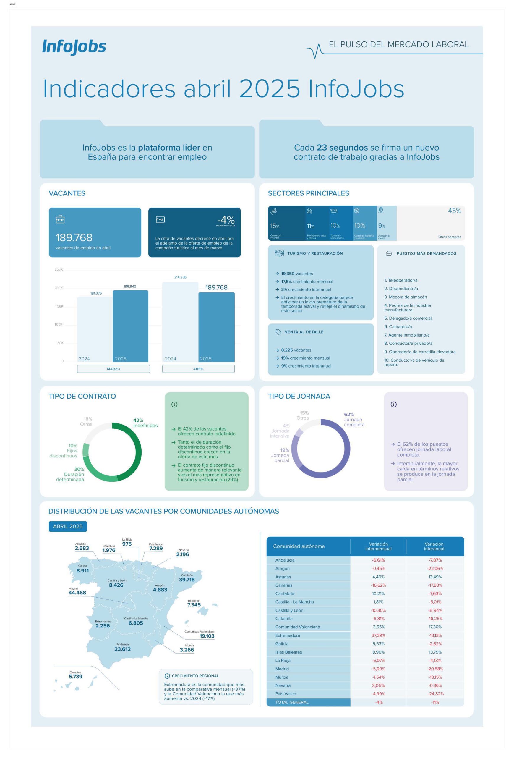 InfoJobs registra 189.700 vacantes en abril, con un aumento destacado de turismo y restauración