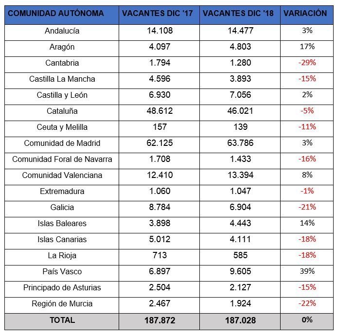 - Las vacantes ofertadas en 2018 han aumentado un 17% respecto a las registradas durante todo el 2017