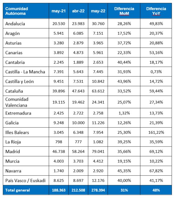 Si se compara con el mes de abril, el número de ofertas de trabajo ha aumentado en todas las comunidades, especialmente en Madrid y Cataluña, con 20.777 puestos más (35,7%), y en Cataluña, con 15.969 puestos más (33,5%).