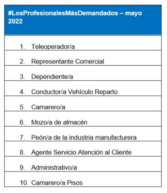 En el mes de mayo, las dos primeras posiciones del ranking de los puestos más demandados las ocupan de nuevo teleoperador/a, con 30.557 puestos de trabajo ofertados y representante comercial, con 24.737. En tercera posición aparece dependiente/a, que suma 13.744 vacantes.