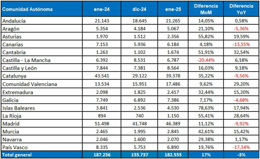 Por comunidades autónomas, las cifras muestran un notable aumento en el número de vacantes en enero, frente a diciembre. La única caída en la comparativa mensual se produce en Castilla-La Mancha, región que baja un 20% en relación con el mes pasado. Si se hace referencia a la diferencia YoY, los descensos se producen en Aragón (-5%), Canarias (-13,5%), Cataluña (-9,5%), Galicia (-5%) y Madrid (-10%).