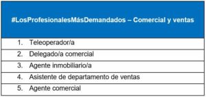 En el mes de enero, las tres primeras posiciones del ranking de los puestos más demandados las ocupan teleoperador/a, con casi 15.800 puestos de trabajo ofertados; delegado/a comercial, con 9.500; y agente inmobiliario/a, con 7.500. Precisamente, esta segunda profesión, debido al ya mencionado crecimiento de la actividad comercial, recogen 2.300 vacantes más que el mes pasado.