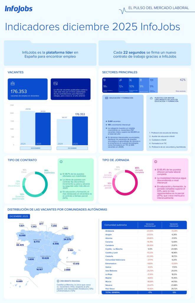 Por su parte, los datos de InfoJobs, la plataforma líder en empleo en España, en diciembre (176.353 vacantes) suponen una caída del 17% respecto al mes anterior, cuando se alcanzaron los 211.723 puestos de trabajo ofertados. Este descenso en el número de vacantes se esperaba por el adelanto de las contrataciones al inicio de la campaña navideña. Sin embargo, la nota positiva se da en la comparativa interanual: las cifras aumentan un 13% frente a diciembre de 2024, cuando la plataforma reportó 155.737 vacantes.