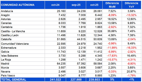 - Análisis por CC. AA: Castilla-La Mancha, la que más crece vs. septiembre; Navarra, la que más sube vs. octubre de 2024