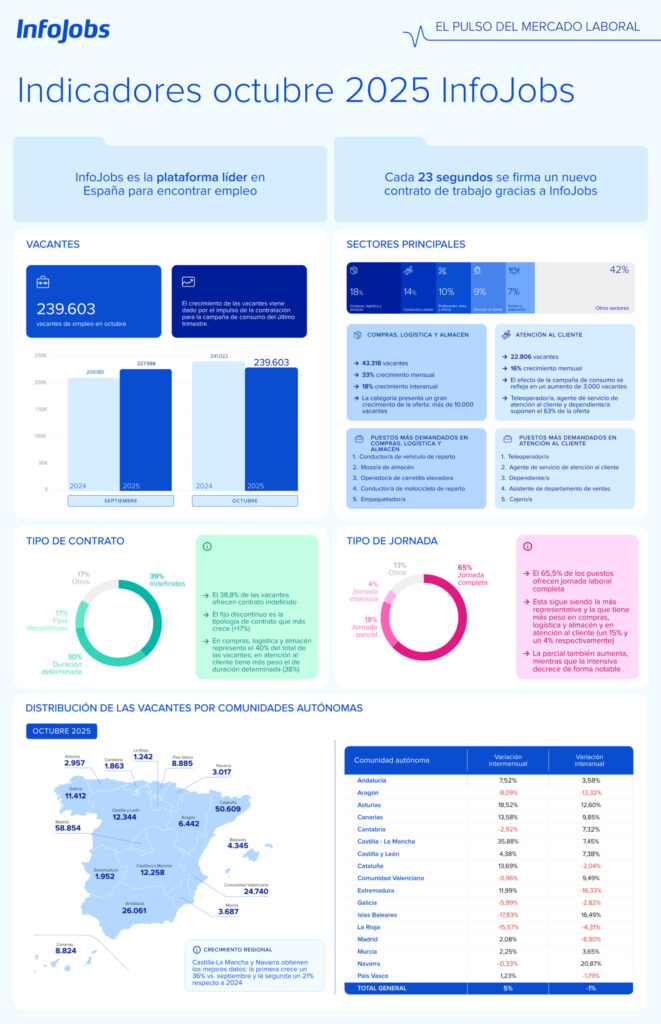 InfoJobs, la plataforma líder en empleo en España, registró el pasado mes de octubre un total de 239.603 vacantes de empleo para trabajar en España, una cifra que se mantiene con respecto a hace un año (241.022 puestos de trabajo ofertados) y sube un 5% en comparación con septiembre, cuando la plataforma reportó 227.988 vacantes.