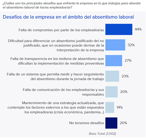 Por otra parte, el 80% de las compañías menciona algún desafío relacionado con el absentismo, y entre los principales motivos detectados existe un consenso en la necesidad de profundizar en el compromiso de los empleados/as para resolverlo. En este sentido, las compañías destacan la falta de compromiso por parte de los trabajadores (44%), la dificultad para diferenciar el absentismo justificado del que no lo está (32%), o la falta de transparencia de los motivos de las ausencias, lo que dificulta aplicar medidas preventivas, en el 27% de las consultas hechas.