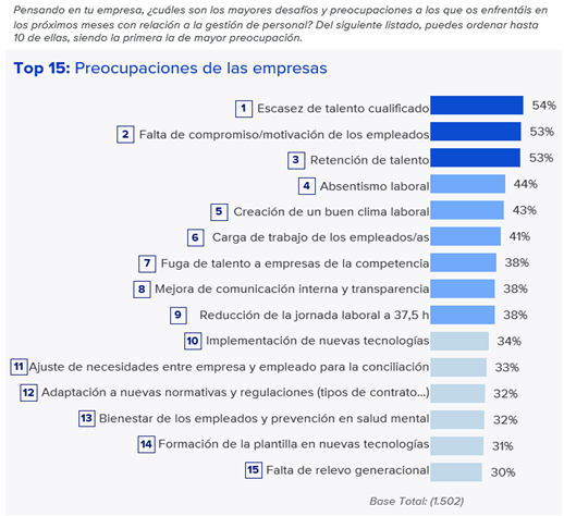 - La escasez de talento cualificado (54%) y la falta de compromiso y motivación de los empleados (53%) lideran las preocupaciones de las compañías, pero el absentismo y la reducción de jornada laboral a 37,5 horas se abren paso entre los desafíos
