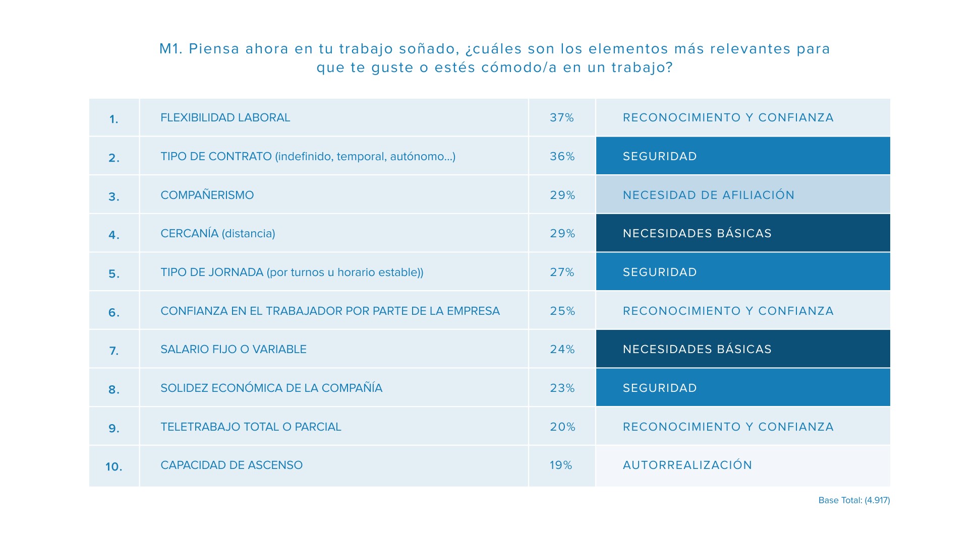 Las respuestas de los encuestados se concentran mayoritariamente en dos escalones: reconocimiento y seguridad, de lo que se desprende que la mayoría de los trabajadores han cubierto sus necesidades más básicas, están conformes con su empleo y aspiran a obtener reconocimiento, pero también les preocupa la estabilidad en cuanto a jornada o contrato. Se prioriza un ambiente laboral estable y que la empresa proporcione las condiciones básicas. En general, todo lo relacionado con bienestar y comodidad (flexibilidad, cercanía o teletrabajo) se abre paso por encima del salario o los beneficios adicionales y demuestra que los trabajadores buscan el equilibrio entre lo personal y lo profesional.