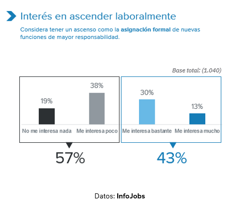 - 1 de cada 5 trabajadores (19%) no quiere adquirir nuevas funciones o responsabilidades, mientras que un 38% tiene poco interés; son los menores de 35 años los más interesados en ascender (57%), 14 p.p. por encima de la media