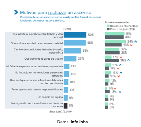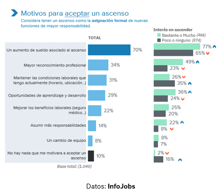 - Los principales motivos para aceptar un ascenso son el aumento salarial y el reconocimiento profesional, mientras que el impacto en la conciliación y la estabilidad son las razones para rechazarlo