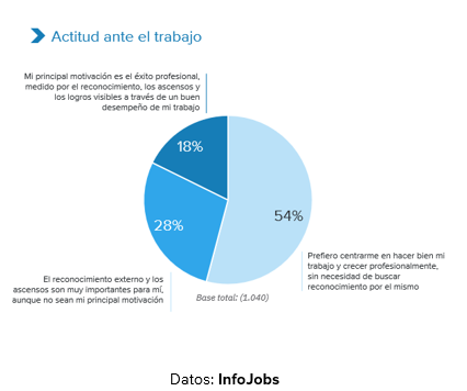 - Actitud ante el trabajo: el 54% de los españoles prefiere centrarse en hacer bien sus tareas y crecer profesionalmente; un 18% tiene como principal motivación obtener logros, ascensos y reconocimiento