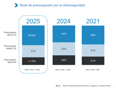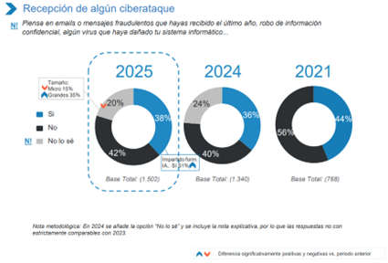 ciberseguridad no se vive de la misma forma en todo el tejido empresarial: a medida que aumenta la dimensión de la compañía, también lo hace la proporción de las que declaran una preocupación elevada y afirman haber recibido intentos de ataque, además de crecer el porcentaje de las que no tienen certeza sobre si los han sufrido.