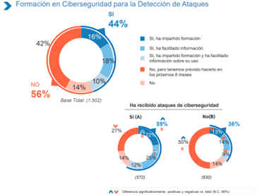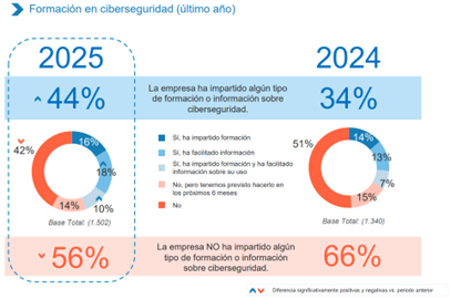 - A pesar de la creciente preocupación, el 56% de las compañías no ha impartido formación ni facilitado información sobre ciberseguridad en el último año, aunque el dato mejora respecto a 2024
