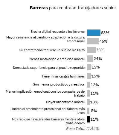 Por otro lado, la brecha digital respecto a los jóvenes aparece como la barrera más destacable a la hora de contratar este tipo de perfiles, con un 53% de menciones, seguida por la mayor resistencia al cambio y la adaptación a la cultura empresarial (46%). En tercer lugar se destaca que su contratación requiere un sueldo más alto (33%). Otros motivos aducidos por las empresas para no contratar a trabajadores de más edad son la menor motivación o ambición laboral (23%), contar con demasiada experiencia para el puesto y tener más cargas familiares que otros trabajadores (ambas con un 15% de las menciones) y ser menos creativos y productivos (12%).