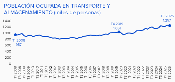 Y más allá de su evolución en cifras absolutas, este sector ha destacado en los últimos años por un crecimiento relativo más acentuado que el de la ocupación total, una tendencia que se ha frenado en la medición de este tercer trimestre de 2025. Así, el incremento interanual de la ocupación en transportes y almacenamiento se ha situado en el 0,6 %, frente al 2,6 % del total. Si tras la pandemia llegó a registrar incrementos interanuales que rozaban el 10 %, su evolución en los dos últimos años es mucho más moderada.