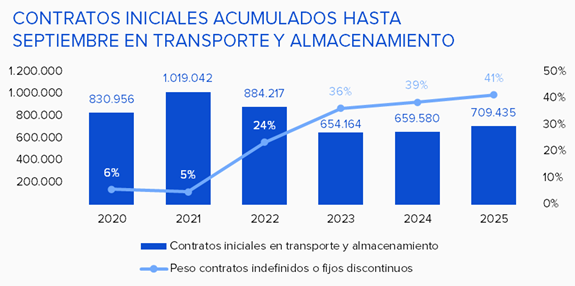 Si se observan los contratos iniciales registrados por el SEPE entre enero y septiembre se puede observar que, de los 11,3 millones que se han firmado, algo más de 700.000 pertenecen a transporte y almacenamiento. Y, de todos ellos, el 41 % son de carácter indefinido o fijo discontinuo. La presencia de estas modalidades de contrato, además, ha crecido significativamente desde la entrada en vigor de la reforma laboral: en 2021 solo suponían el 5 % de los contratos y, desde entonces, ese porcentaje ha ido aumentando de manera progresiva cada año hasta alcanzar el 41 % actual.