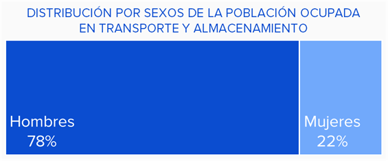 Si se analiza con más detalle la población ocupada en este sector, se puede apreciar que en él existen desequilibrios como la brecha de género. Actualmente solo dos de cada diez personas ocupadas en transporte y almacenamiento son mujeres, frente al 78 % de hombres. Además, aunque en los últimos años esta brecha se haya reducido ligeramente —hace justo diez años la cifra de hombres era del 81 %, tres puntos más que ahora—, la distribución del empleo en este sector sigue siendo claramente desigual.
